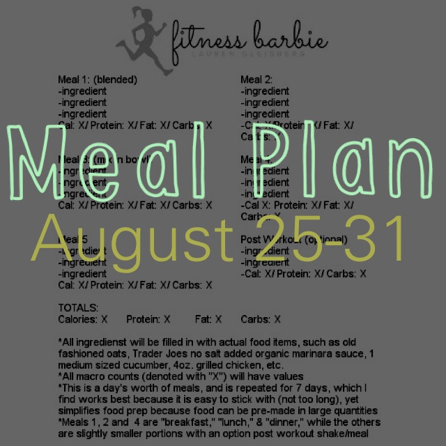 Changes to note this week: by now, many of you have reached out to me saying that you never realized that eating more could actually benefit you, leading to decreased fat/weight and fuel for workouts and building a fit body. What I love about my meal plan is that I never feel hungry: feedback many of you mentioned as well. This week, I upped my calories by 100 – small changes on a weekly basis will NOT lead to instant fat gain; rather, one is actually able to increase their metabolic capacity by doing so. I am always working on keeping my metabolism healthy and fast, which is what this weeks meal plan is based around!