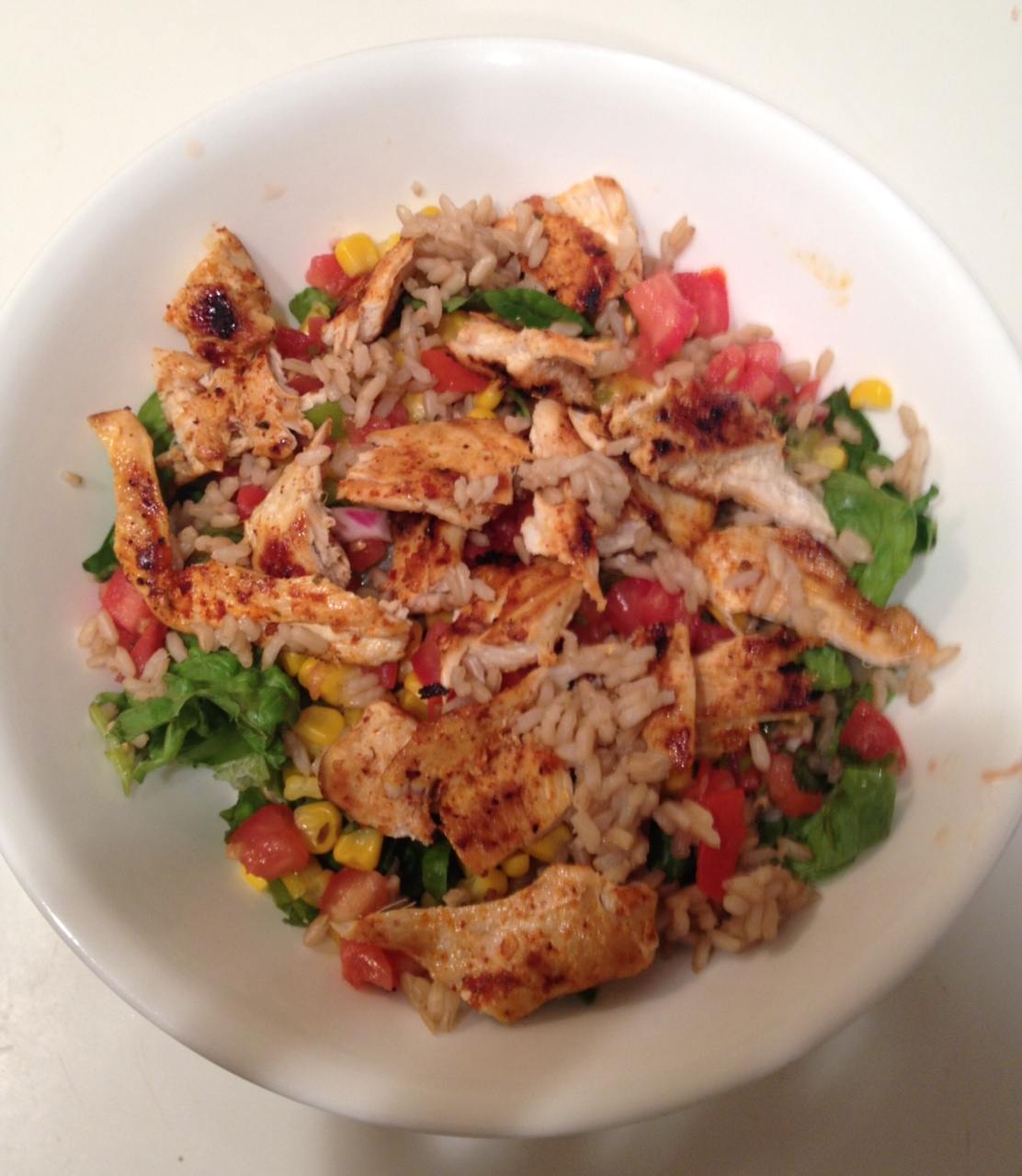 -Prepare a bowl of brown rice, salad, corn and fresh salta
